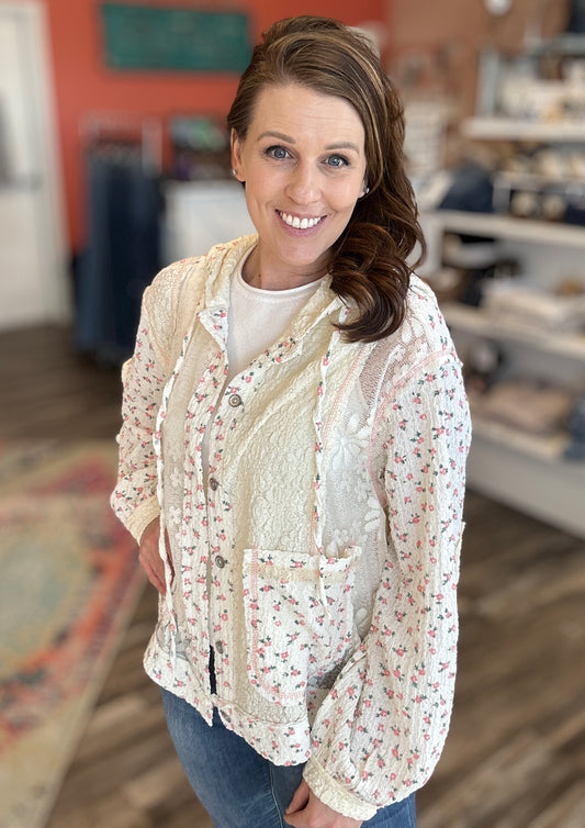Regular price $52.00 USDRegular priceUnit price / perSale price $52.00 USDCream Floral and Lace Hooded Jacket