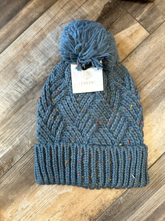 Dusty Blue & Multicolored Patterned Pom Beanie