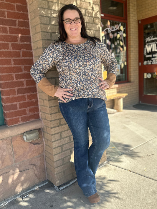 Dusty Teal Floral Waffle Knit Long Sleeve
