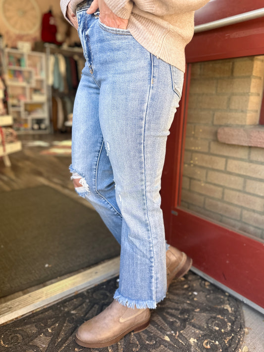 Regular price $64.00 USDRegular priceUnit price / perSale price $64.00 USDLight Wash Frayed Bootcut Jeans