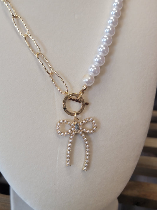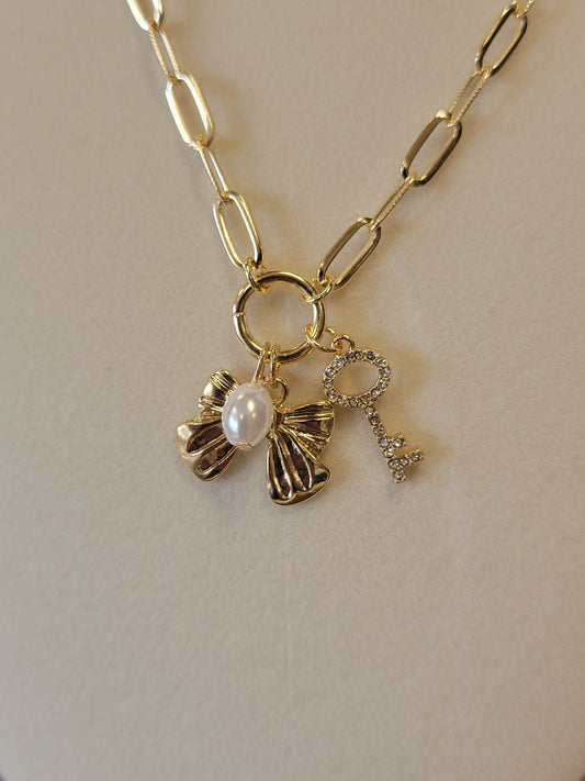 Gold Link & Pearl Necklace with Charm
