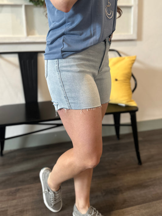 Regular price $49.00 USDRegular priceUnit price / perSale price $49.00 USDLight Wash High Waist Raw Hem Shorts