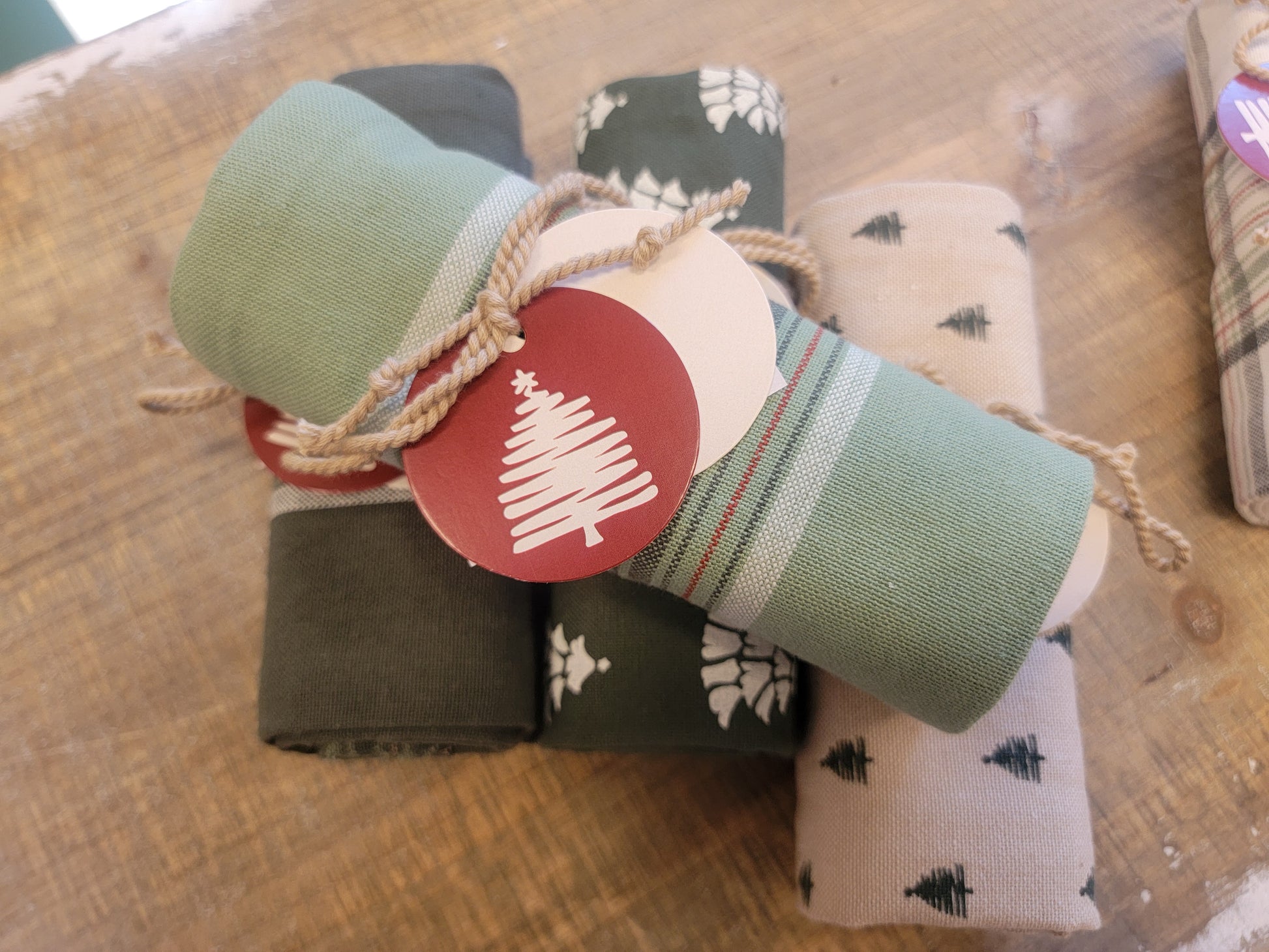 Add a festive touch to your kitchen with these Balsam Fir Assorted Dishtowels. Featuring playful patterns like tan with balsam trees, white with green stripes, green with Christmas trees, green with stripes and a hunter green with stripes. These towels bring holiday cheer while keeping your dishes dry and your space stylish. Perfect for cozy winter vibes and everyday use!