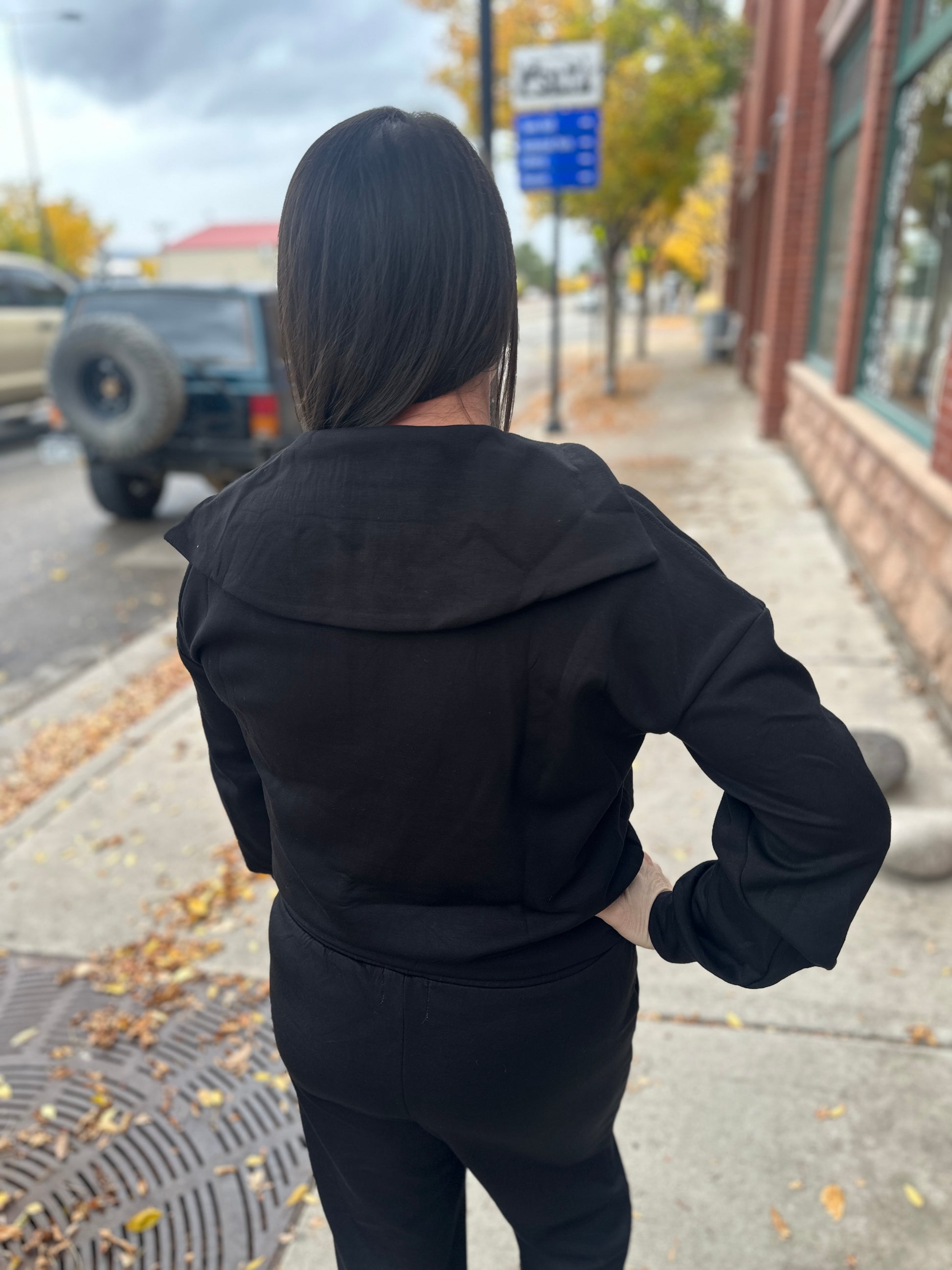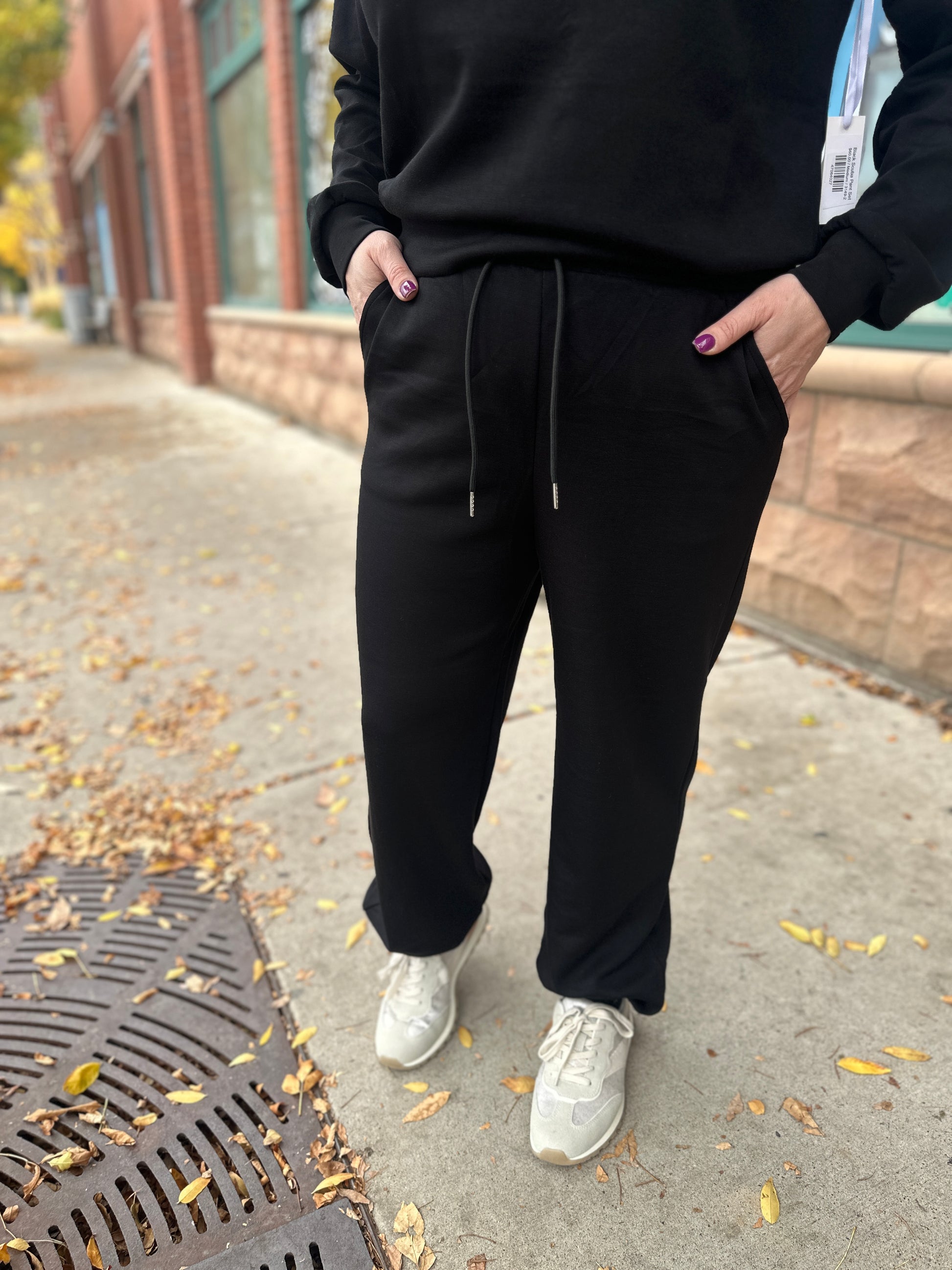 Experience comfort and style with this Black Pant Set, featuring an incredibly soft long sleeve pullover sweater with a 3/4 front zipper and a prominent collar for a refined look. The matching bottoms offer a tailored fit with an elastic waistband and cuffs, complemented by a drawstring and convenient pockets. Crafted from stretchy fabric, this set ensures effortless movement while maintaining a polished appearance. Ideal for relaxing at home or casual outings with sophisticated ease.