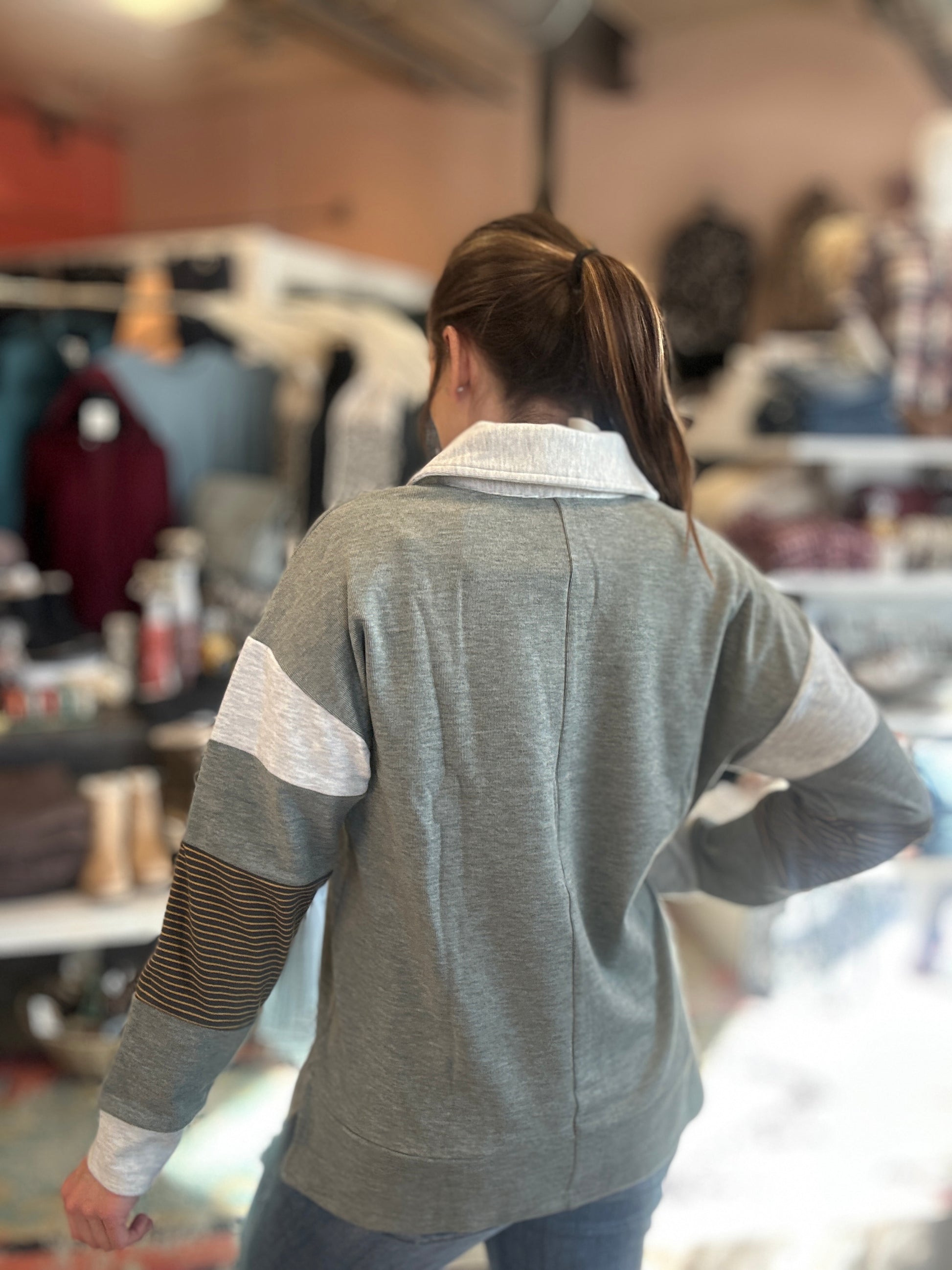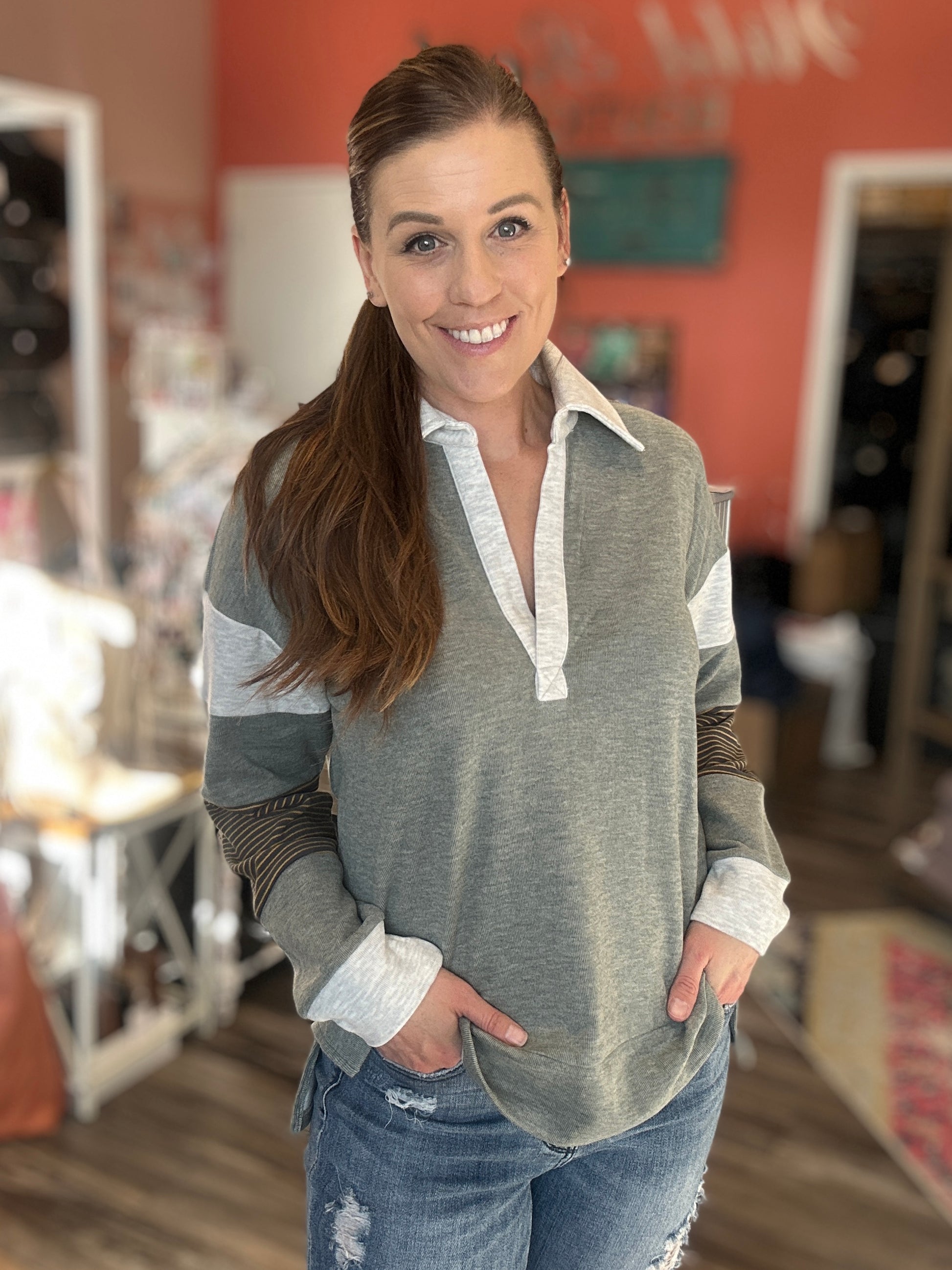 Stay cozy and stylish in this playful brushed pullover featuring olive and grey tones with charcoal and mustard striped accents on the sleeves. Its high-low hem and side slits add a fun, modern twist, making it perfect for layering or wearing on its own for effortless casual charm. Super soft and slightly oversized. Great stretch too.