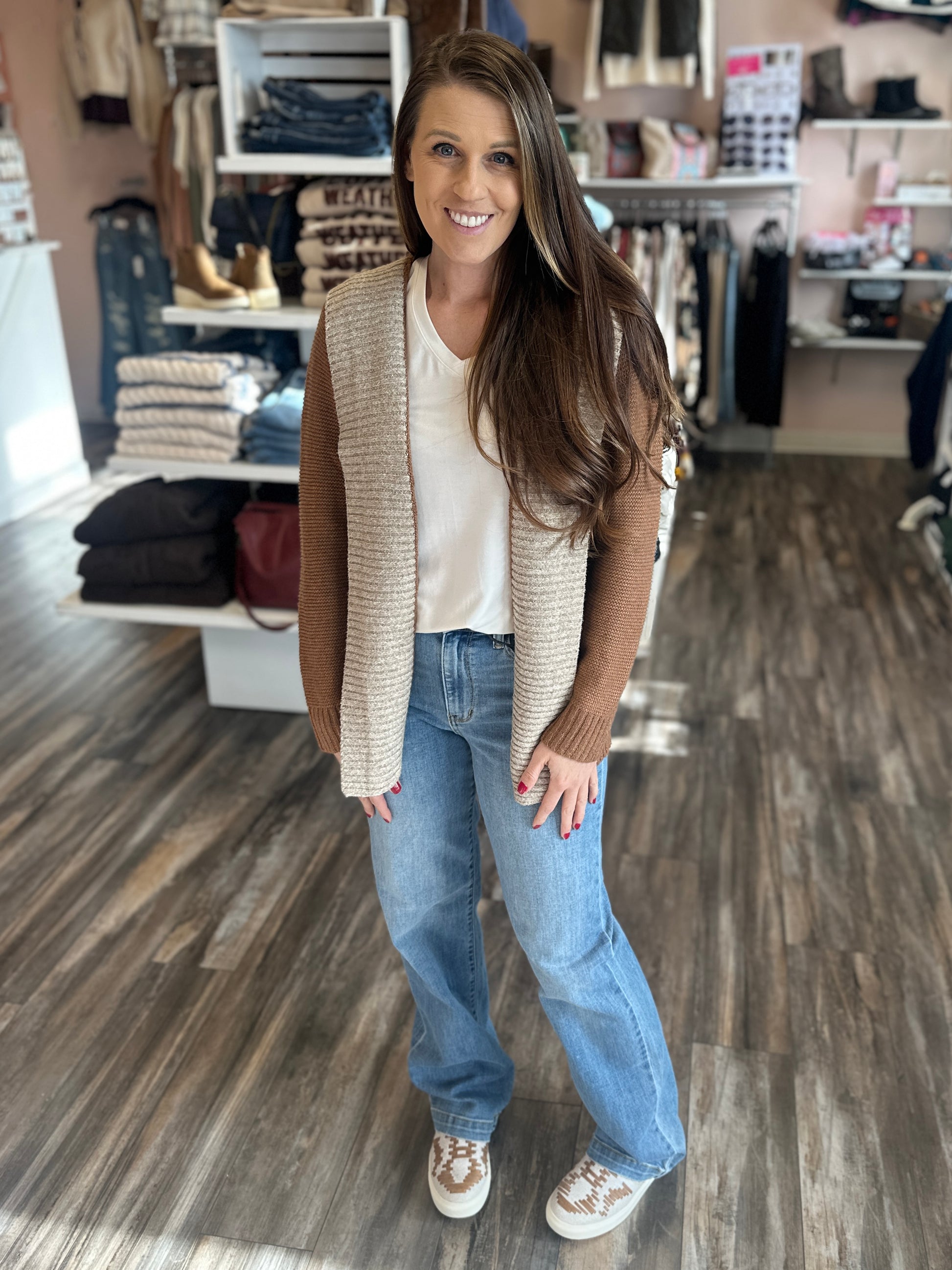 This sophisticated camel cardigan features a heavy knit body complemented by contrasting taupe trim along the front, creating a refined and stylish look. Designed with a hood and practical front pockets, it offers both comfort and functionality. The soft, stretchy fabric ensures a cozy fit, perfect for elevating your layering essentials with understated elegance.