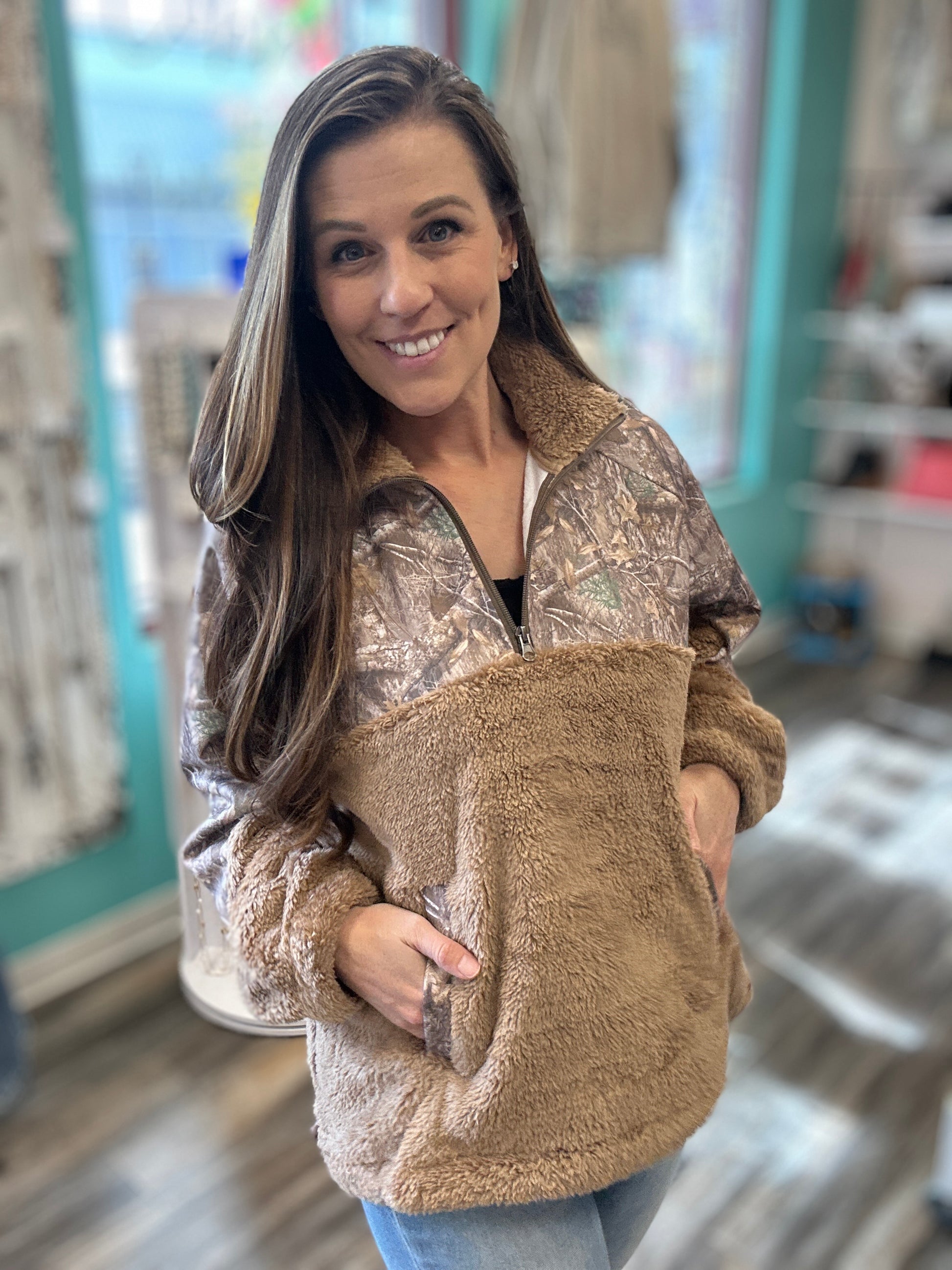 Cozy meets cool in this super soft camo sherpa pullover! Featuring a 3/4 zip for easy layering, a kangaroo pocket to keep hands warm (or stashing snacks), and a zip cord bungy to cinch the waist hem for the perfect fit. It’s your new go-to for chasing adventures or just lounging in style.