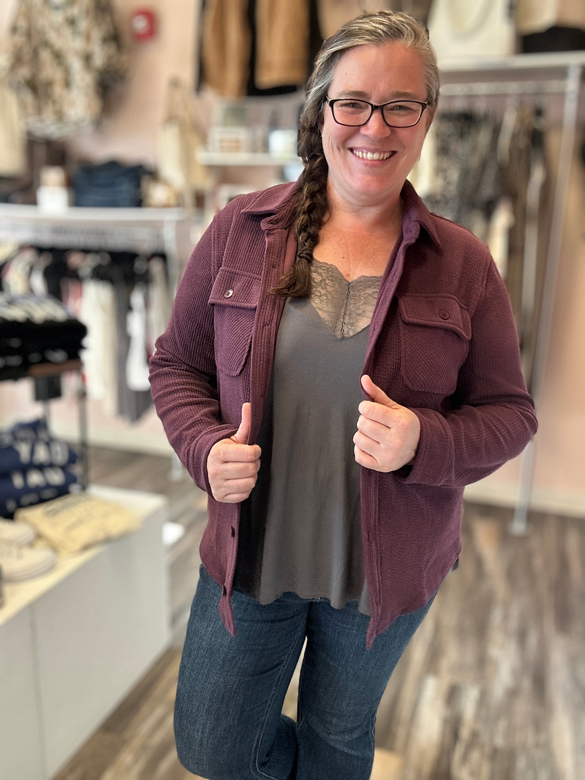 Cozy meets cool with this plum corduroy button-up shacket! Its soft texture and rich color bring warmth and style, while the handy chest pocket is perfect for stashing little treasures. Layer it up or wear it solo—this shacket’s playful vibe makes every outfit pop.