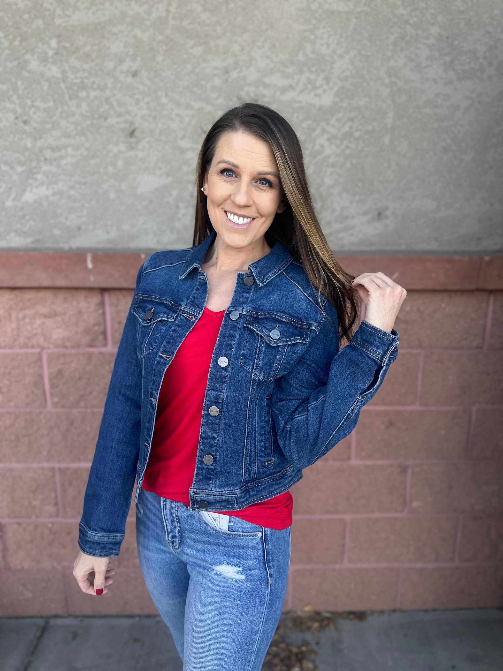 Throw on this Dark Wash Denim Jacket for instant cool-girl vibes. Crafted in a crisp, non-distressed denim, it's the perfect layer for any season. The slightly cropped cut hits just right, while functional front pockets keep your essentials close. Whether you're dressing up a sundress or pairing it with your favorite jeans, this wardrobe staple delivers timeless style with a modern twist.