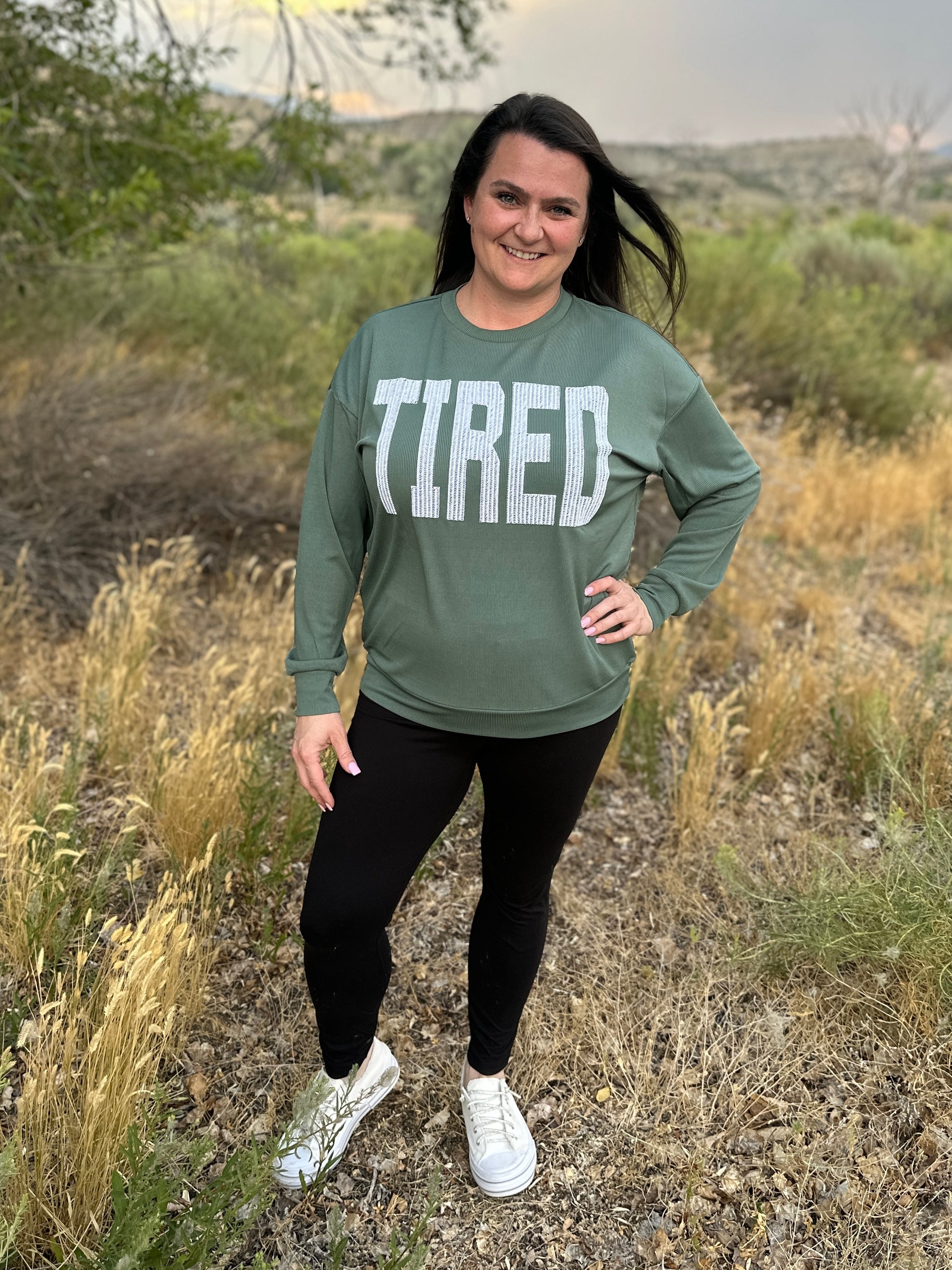 Stay cozy and cheeky in this moss-colored ribbed long sleeve pullover, featuring a playful embroidered "Tired" print. Perfect for lounging or casual days, its soft texture keeps you comfy while the witty design adds a fun twist to your relaxed look. **oversized fit