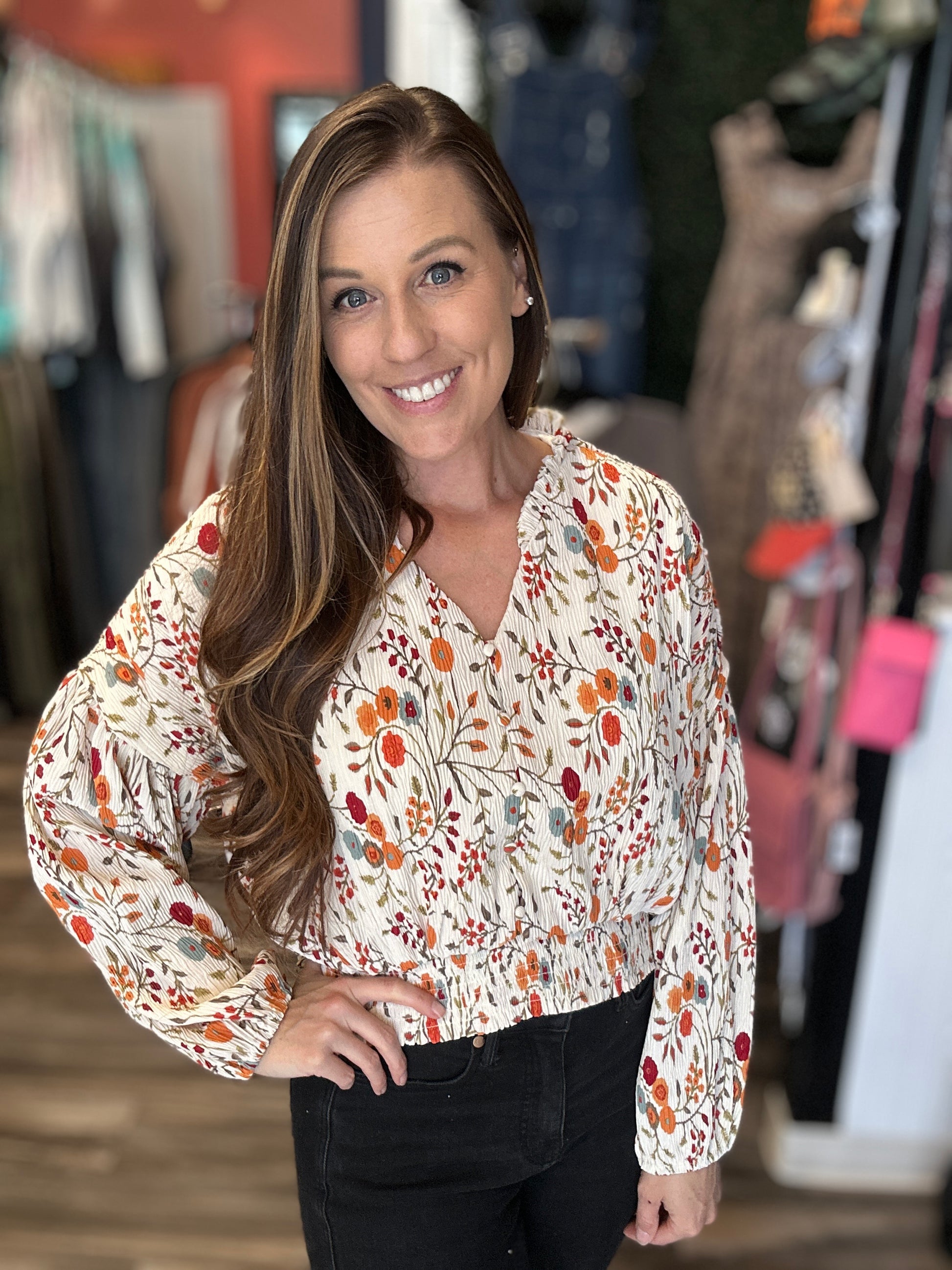 Embrace the season with this playful Fall Floral Cropped Long Sleeve top. Crafted from crinkle crepe fabric, it features a vibrant mix of orange, blue, green, and burgundy florals that bring your autumn wardrobe to life. The V-neck is accented with a delicate ruffle detail, while elastic button front and ruched cuffs plus hem offer a comfy, flattering fit perfect for layering or wearing on its own.