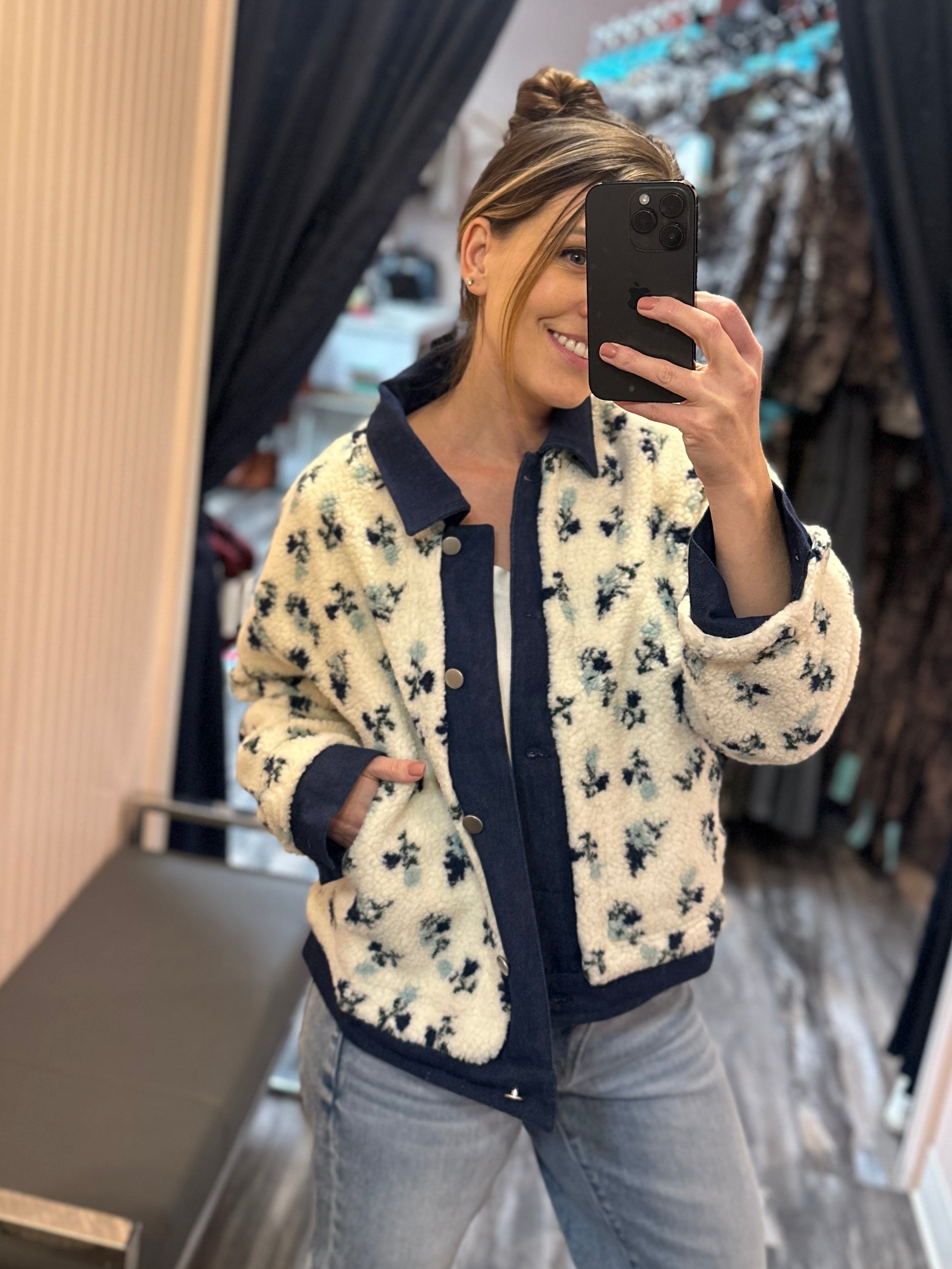 Layer up in style with this charming floral collared button-up jacket! Perfect for those in-between weather days, this cozy sherpa piece brings warmth and personality to any outfit. The classic collar and button-front design make it easy to dress up or down, while the soft sherpa lining keeps you snug and comfortable. Whether you're running errands or heading out for a casual adventure, this jacket is your go-to companion for effortless, feel-good fashion.