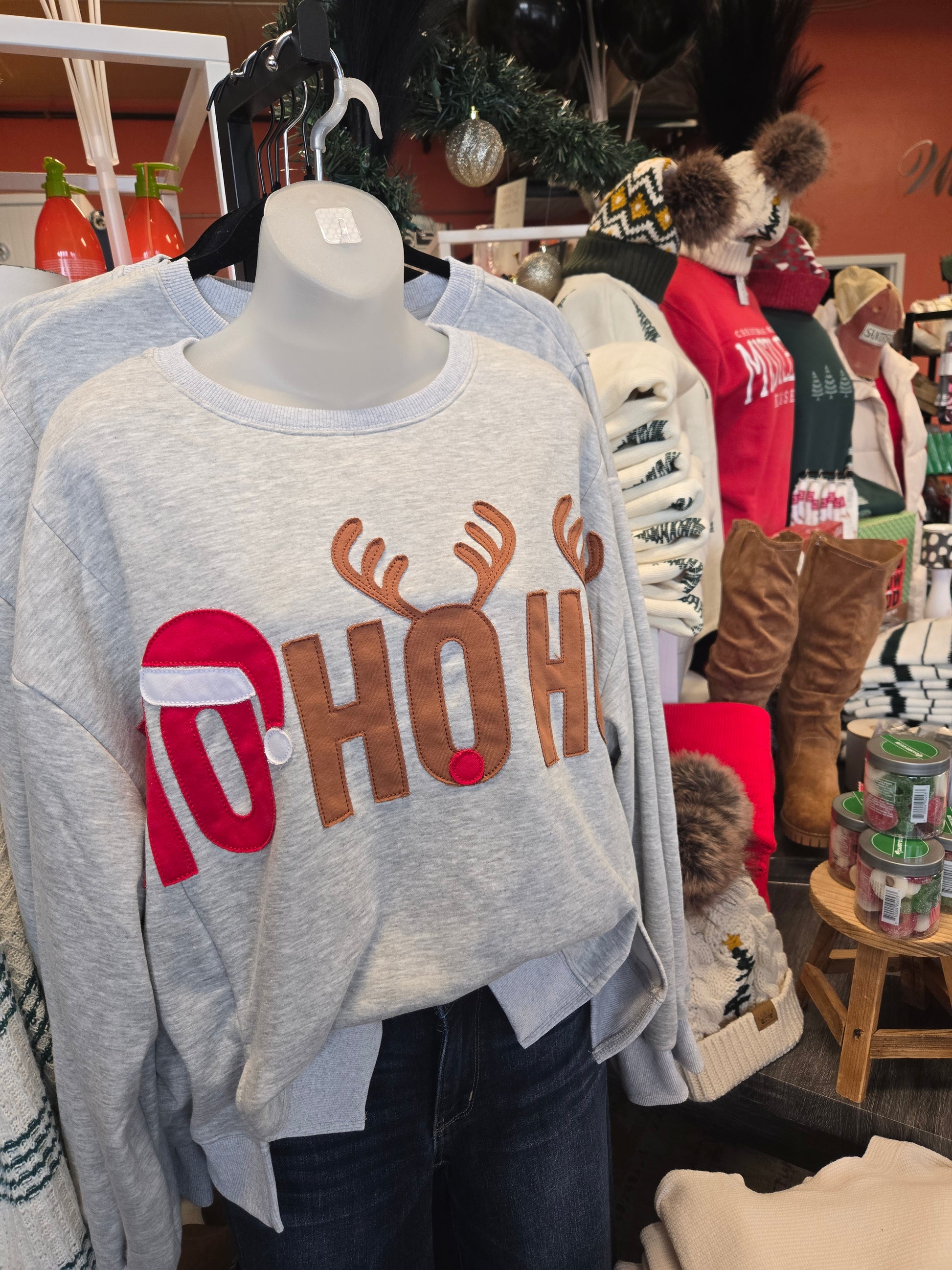Celebrate the season in style with the Ho Ho Ho Sweater. This heathered grey cozy piece features a festive red and brown "HO HO HO" graphic showcasing a Santa hat and reindeer antlers and a bright red nose. Its oversized fit and side slit ensure a relaxed, comfy vibe, while the super soft fabric keeps you feeling oh-so-comfy all day long. Perfect for holiday fun and cozy moments!