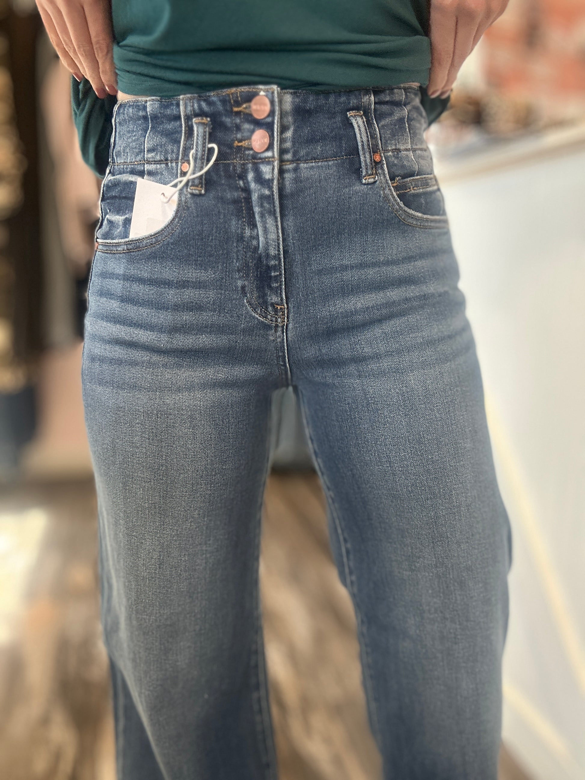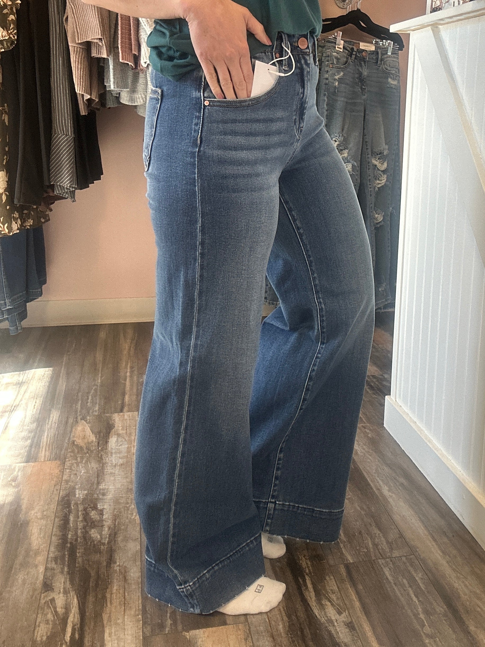 The June Wide Leg Seam Detail Jeans feature a high-waisted design and a dark wash, providing a flattering silhouette. With seam detail that enhances the structure and subtle distressing at the hem, these jeans combine style with durability, making them a versatile addition to any wardrobe.