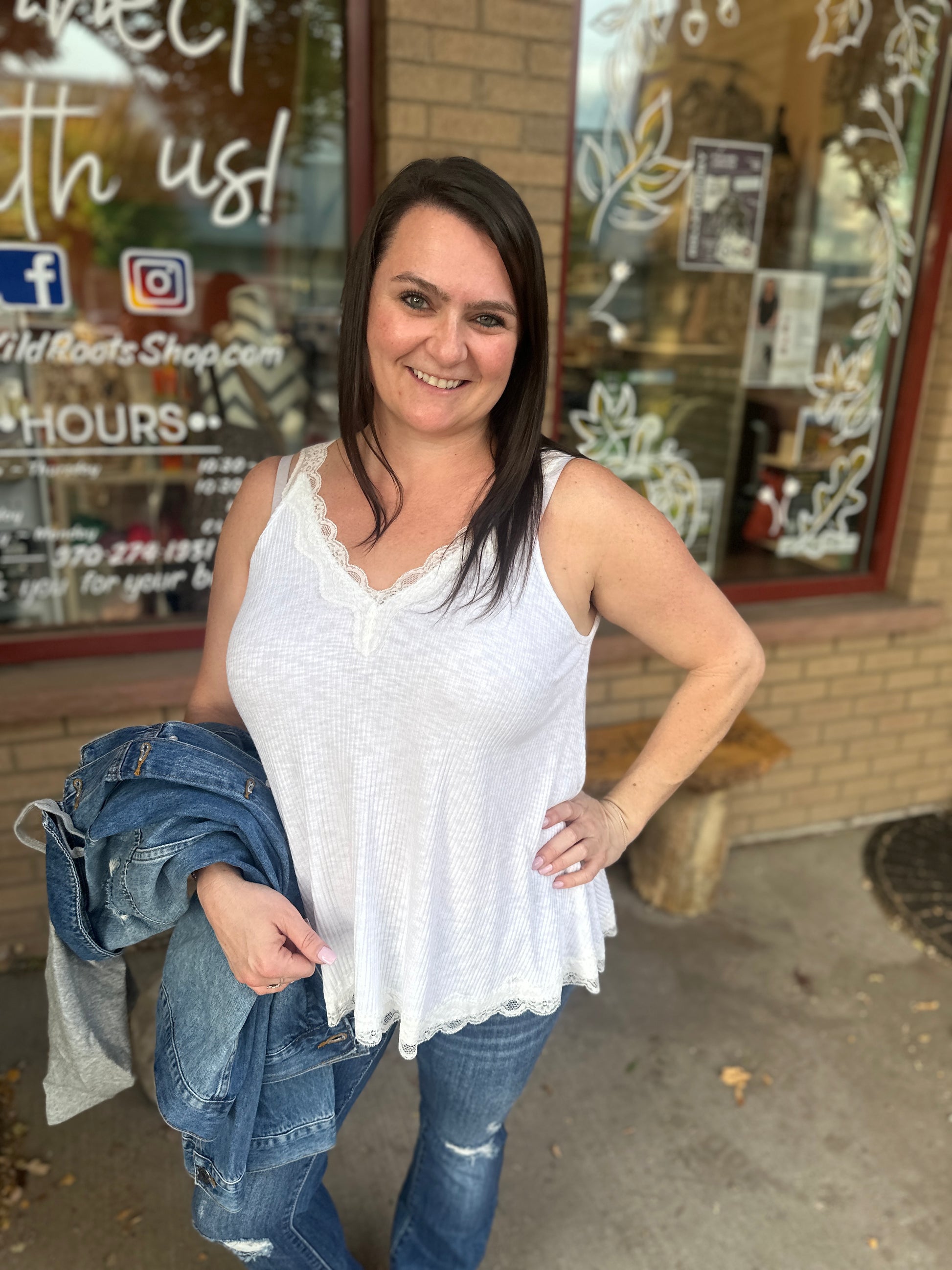 Elevate your wardrobe with this Lace A-Line Tank, crafted from soft waffle knit fabric that offers exceptional stretch and a graceful, flowy silhouette. Delicate lace straps and intricate lace trim along the V-neck, back and hem add a refined touch, blending comfort with timeless elegance. Perfect for layering or wearing alone, this tank effortlessly enhances any ensemble with its sophisticated charm.