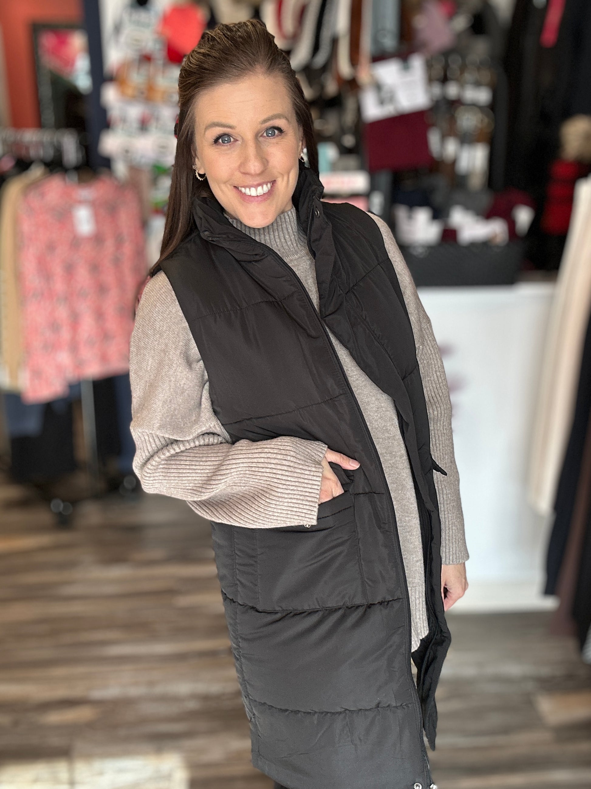 Stay cozy and stylish with our Longline Vest, available in dark green or classic black. Featuring a zipper front and a high collar, it’s perfect for adding a fun twist to your layering game. With handy front pockets to stash your essentials, this vest brings both comfort and playfulness to your everyday look.