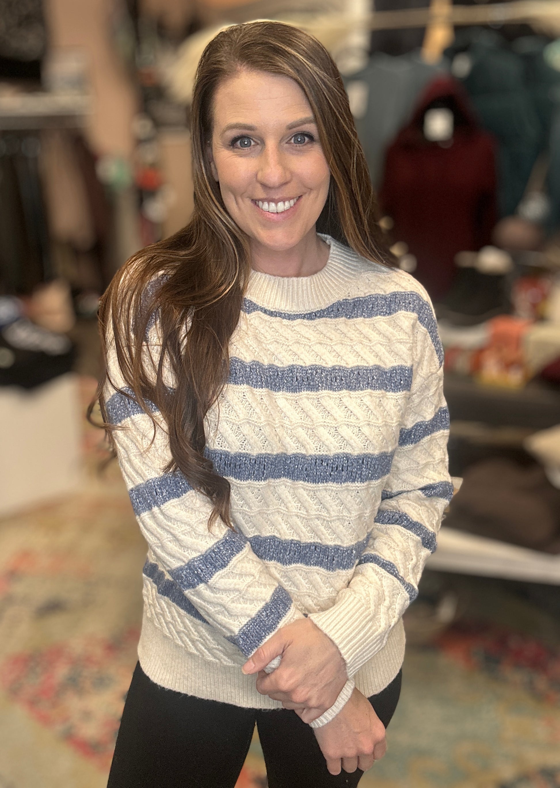 Wrap yourself in cozy charm with this cream and blue knit sweater, featuring playful blue stripes accented by a touch of shimmering silver metallic lurex. Soft and stretchy, it moves with you, making comfort stylish and effortless. Perfect for brightening up chilly days with a splash of sparkle and fun!