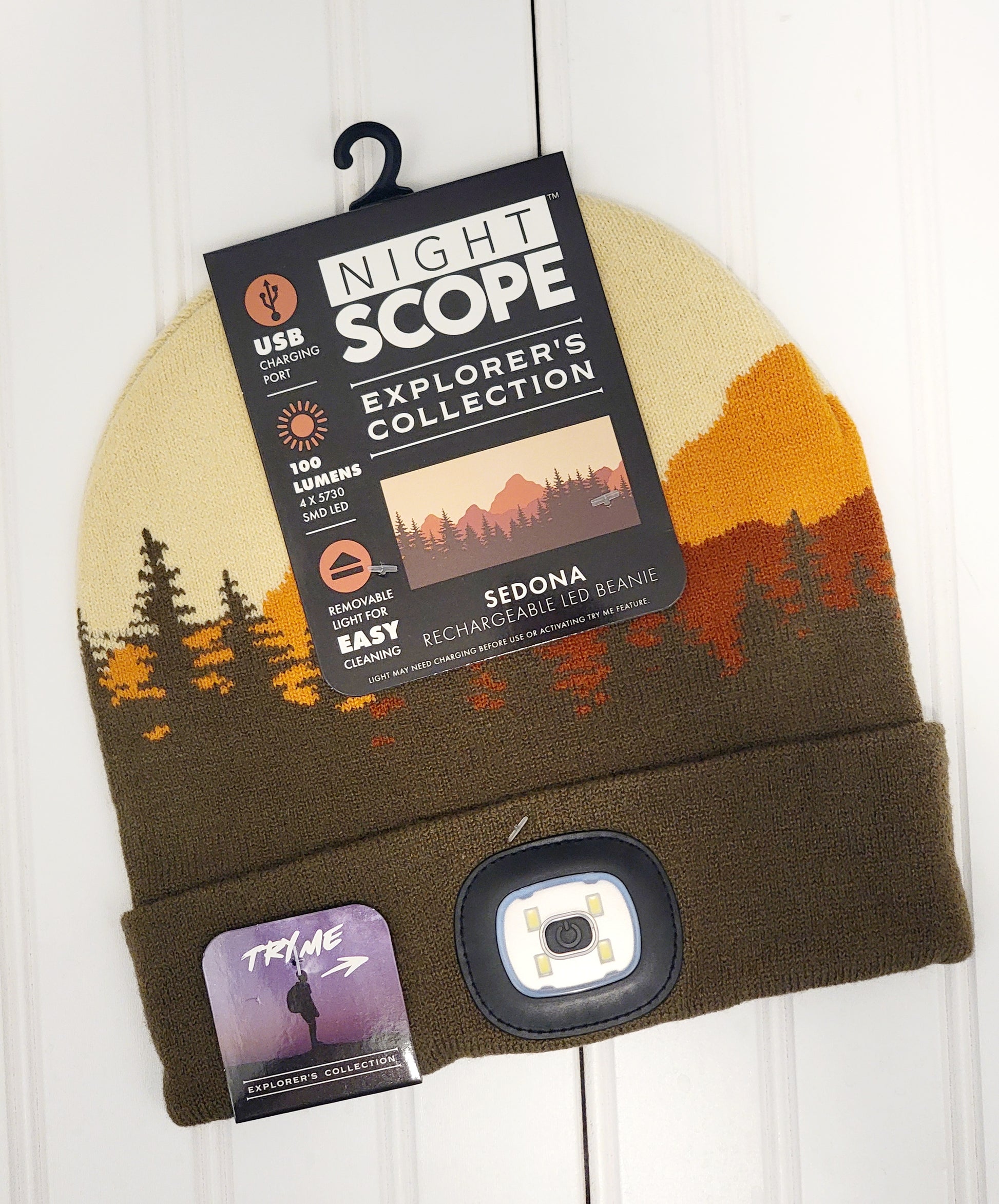 Stay safe and stylish with the Night Scope Explores Beanie. This classic knit beanie features an ultra bright LED beam, perfect for outdoor adventures. With push-button activation and 3 levels of brightness, it's convenient and versatile. The removable and rechargeable light pod makes it all the more practical. Choose from 4 wilderness inspired styles and enjoy machine washable convenience. One size fits most.