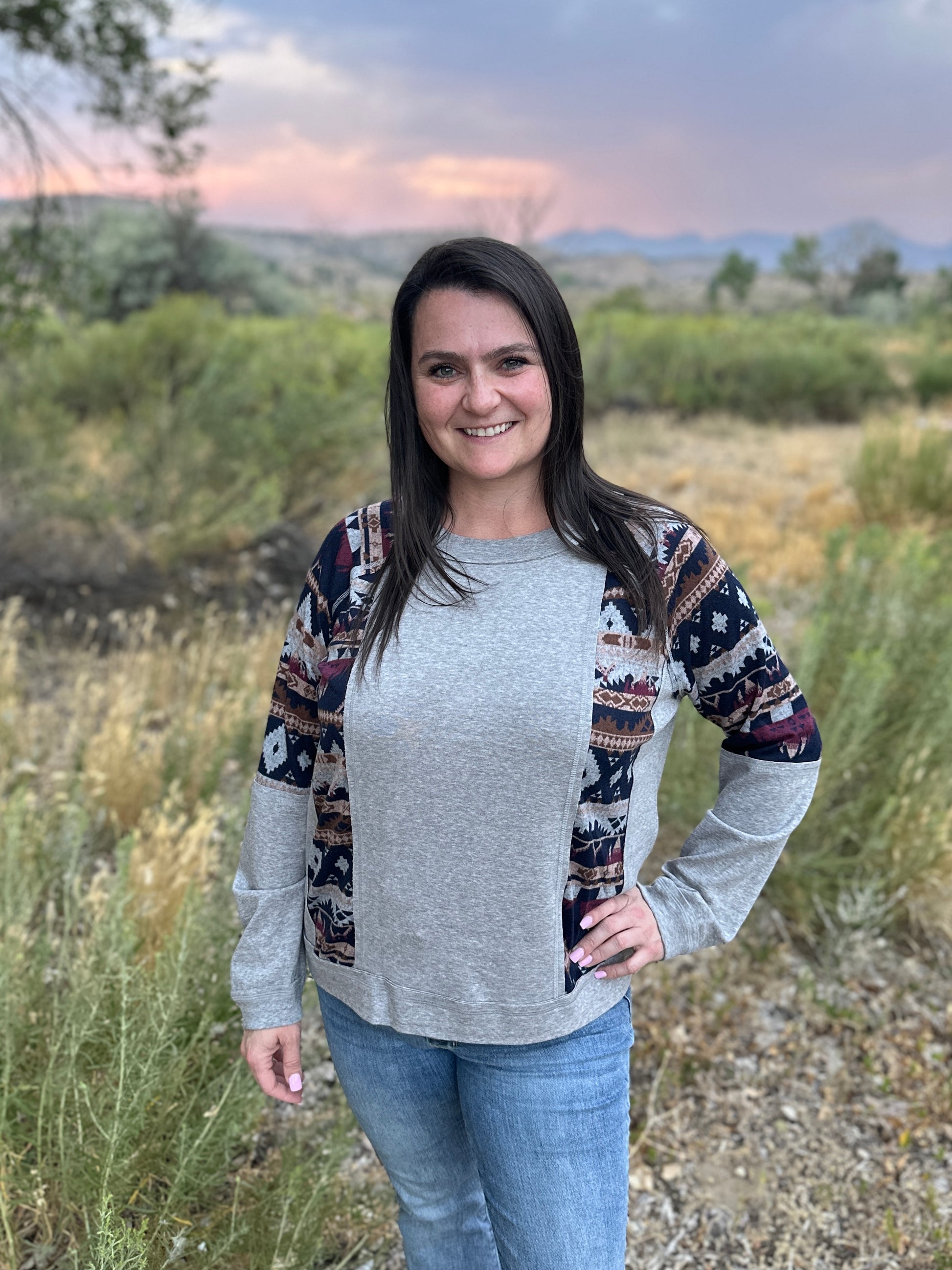 Stay cozy and stylish with this grey long sleeve raglan featuring charming Nordic patterns on the sleeves and front. The playful design is complemented by raw hem details along the sides, adding a touch of casual flair to your look. Perfect for layering or wearing on its own, this top brings a fun twist to your everyday wardrobe.