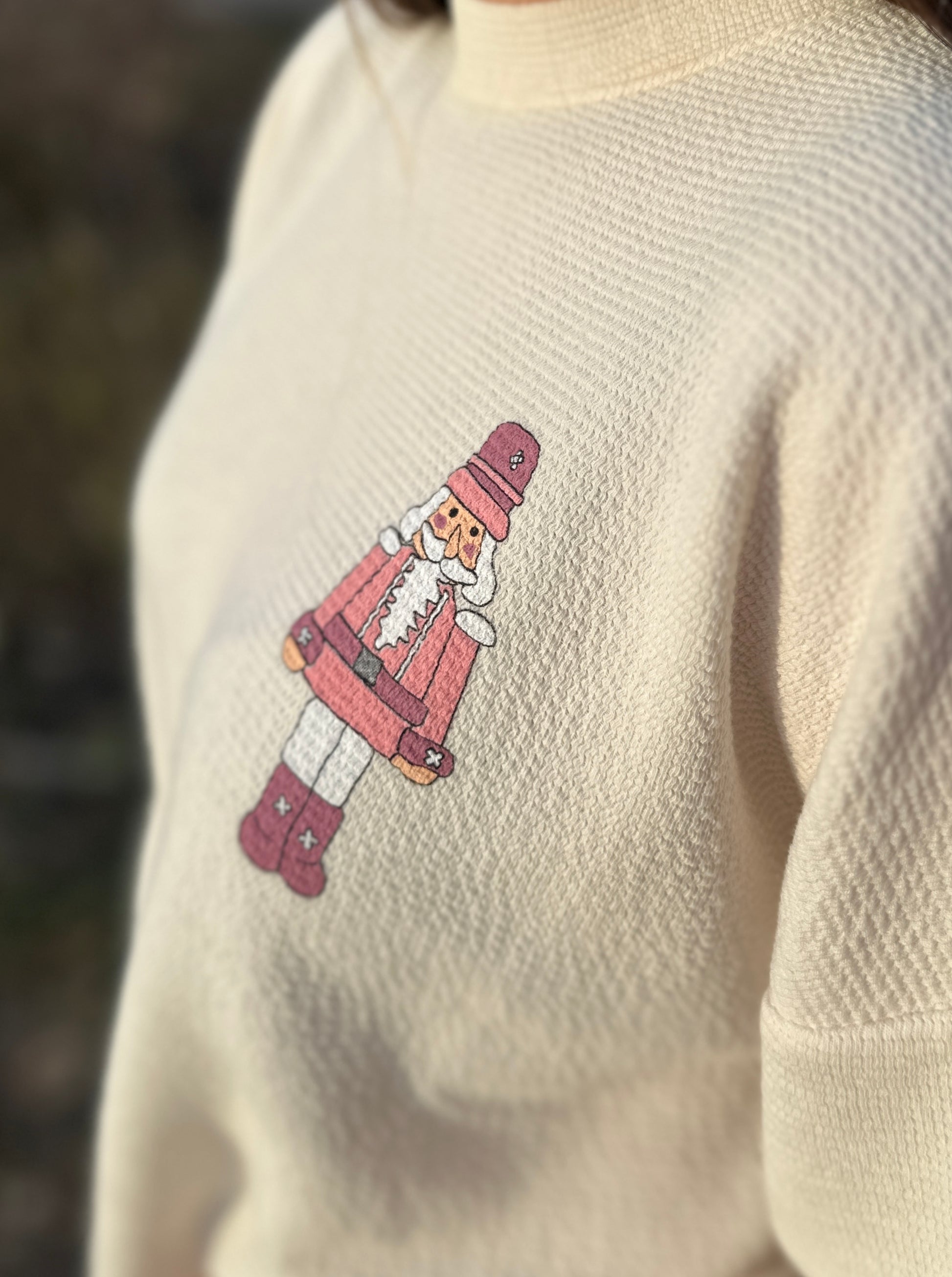 Cozy up in our "Nutcracker" Cookie Graphic Knit Sweatshirt, featuring a soft, cloudy knit fabric that feels like a warm hug. Playful and charming, it showcases a delightful nutcracker-inspired cookie design that adds a festive touch to your casual wardrobe. Perfect for chilly days when comfort and whimsy are a must.
