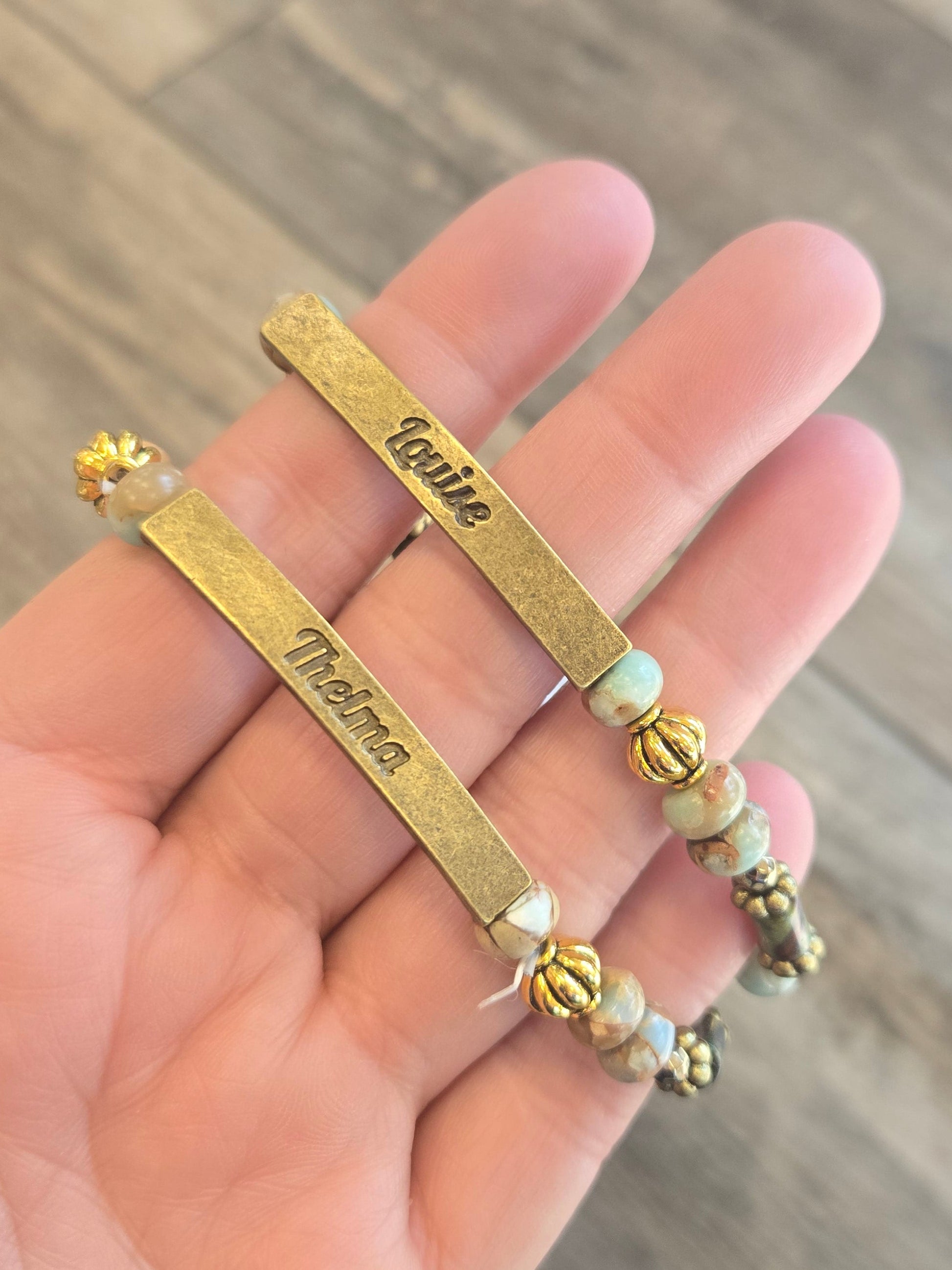 Bring bold energy to your look with the Sassy Bracelet Thelma & Louise Featuring a metal pendant engraved with "Thelma" & "Louise" comes in three styles: bronze, gold or silver. Beads may vary in color. Set of 2. one for you and one for your bestie.