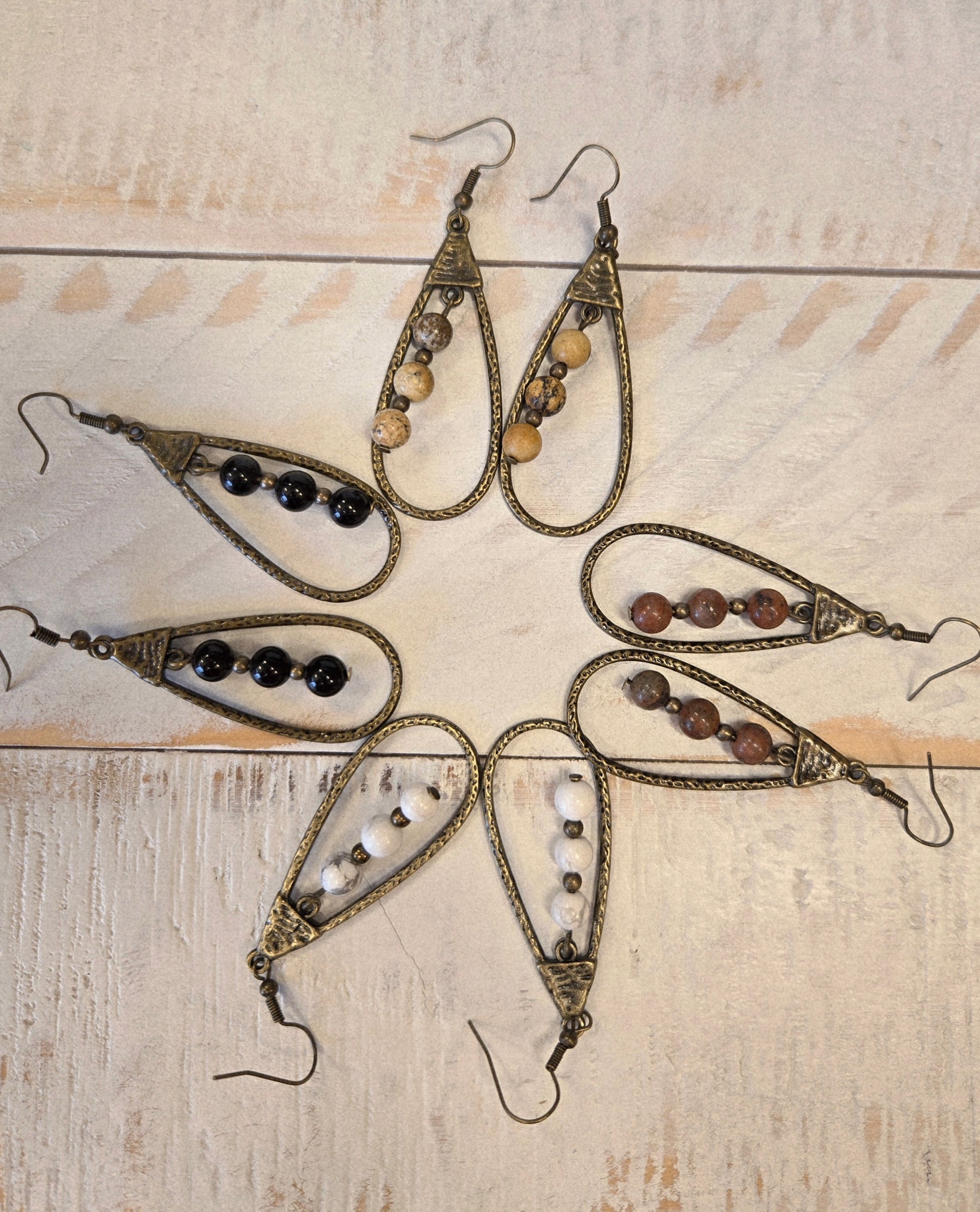 Add a fun twist to your look with the Sherri Earrings. These fishhook earrings feature an open etched teardrop design, spotlighting three colorful beads—choose from red jasper, white, African turquoise, or black—to brighten your day. Light and easy to wear, they're the perfect playful pop of color for any outfit.