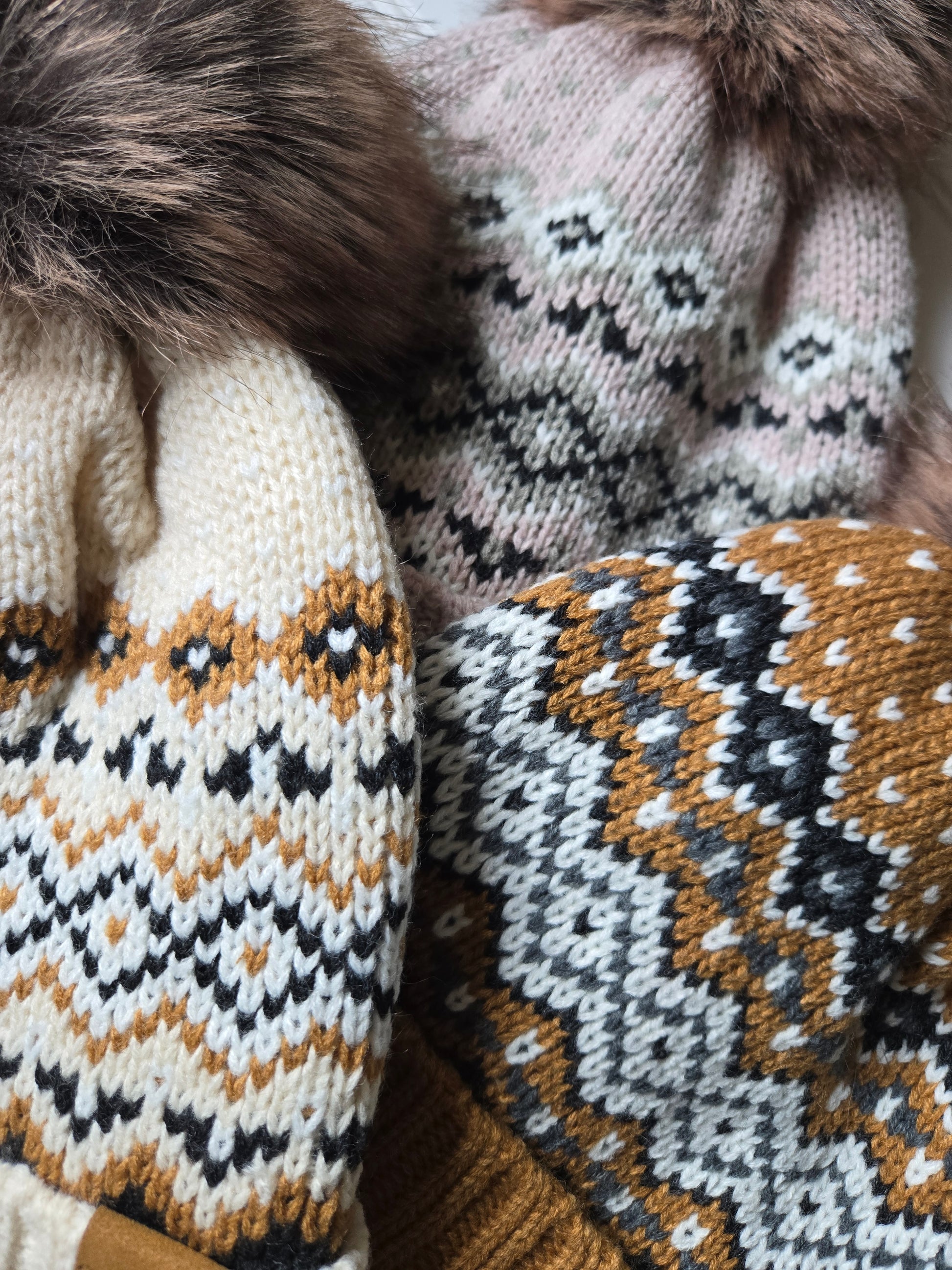 Stay cozy and cute with the Snowflake + Heart Knit Pom Beanie! This playful knit hat features a charming small heart and snowflake pattern, topped with a fluffy faux fur pom for added fun. Fully fleece-lined, it keeps your head warm and comfy on chilly days, making it the perfect winter companion for a touch of cheerful style.