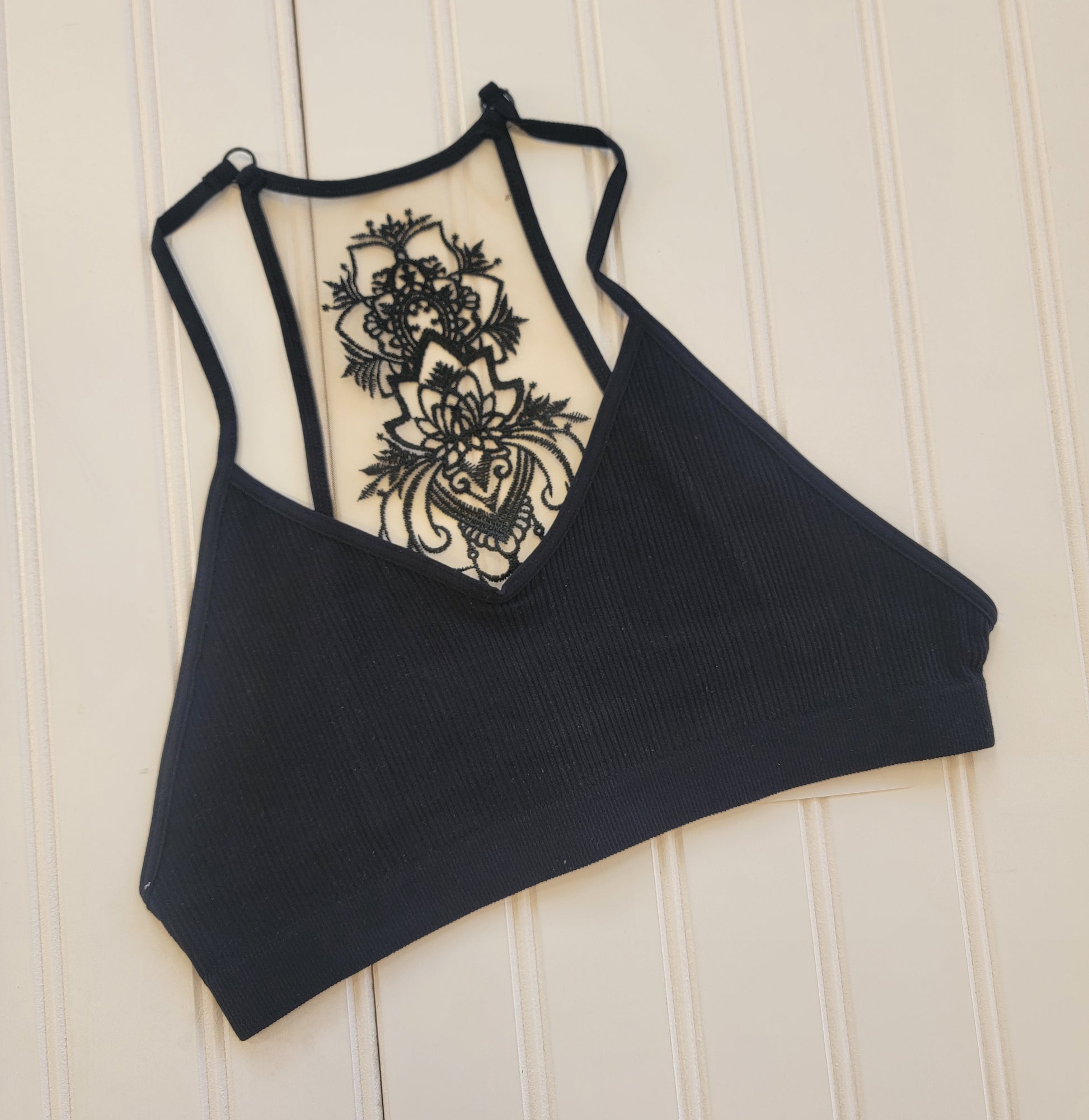 Experience delicate comfort and style with our Tattoo Mesh Racerback Bralette. Made with a ribbed, stretchy fabric and a unique tattoo mesh racerback design, this bralette provides a perfect blend of support and breathability. Elevate your lingerie game with this must-have piece! No padding and does not have adjustable straps.