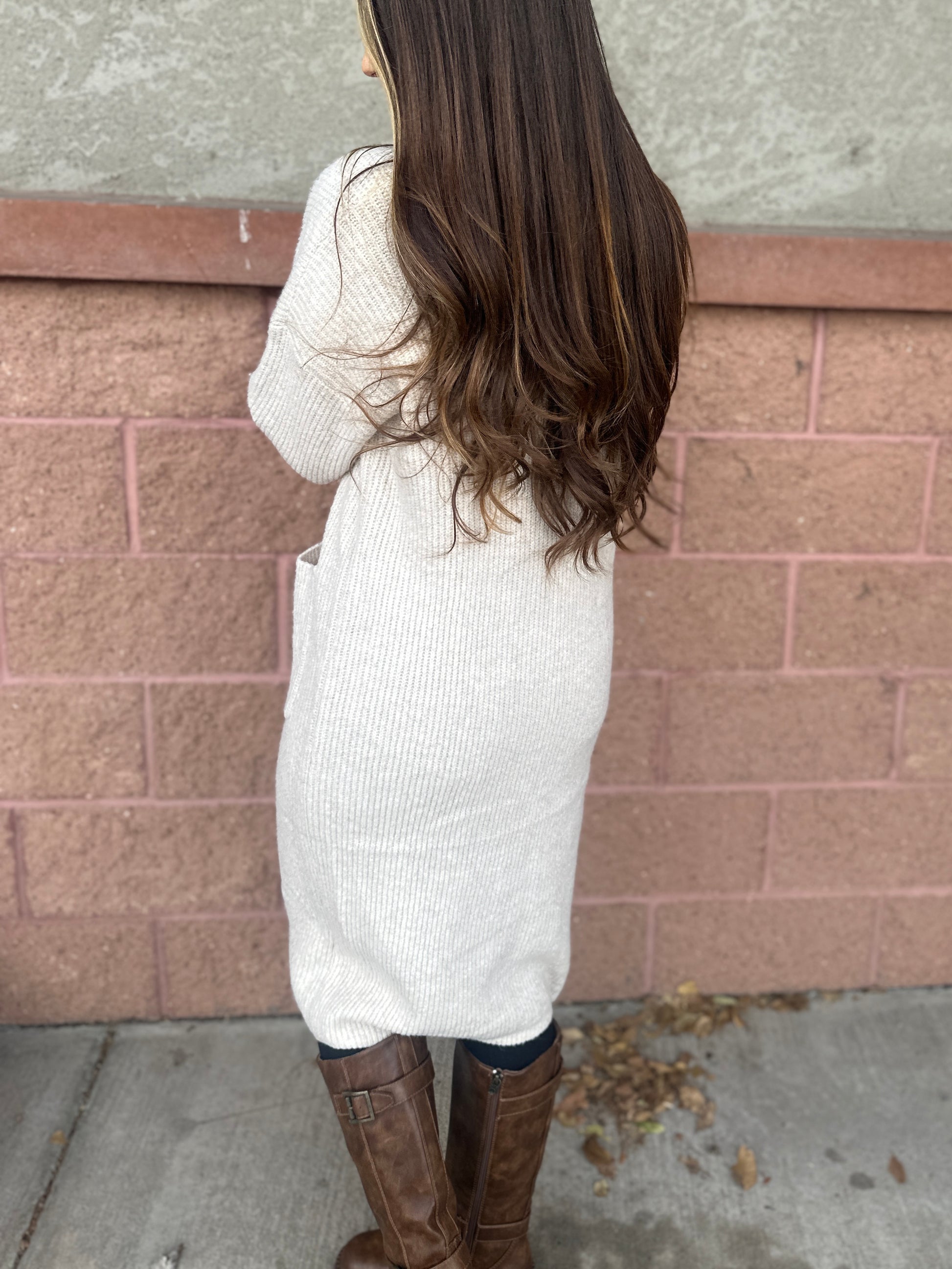 Cozy up in this taupe knit cardigan that feels like a warm hug! Its soft, stretchy fabric lets you move freely, while long front pockets add a stylish touch and a handy spot for your essentials. Perfect for layering, it’s your go-to for comfy, laid-back days with a playful twist.