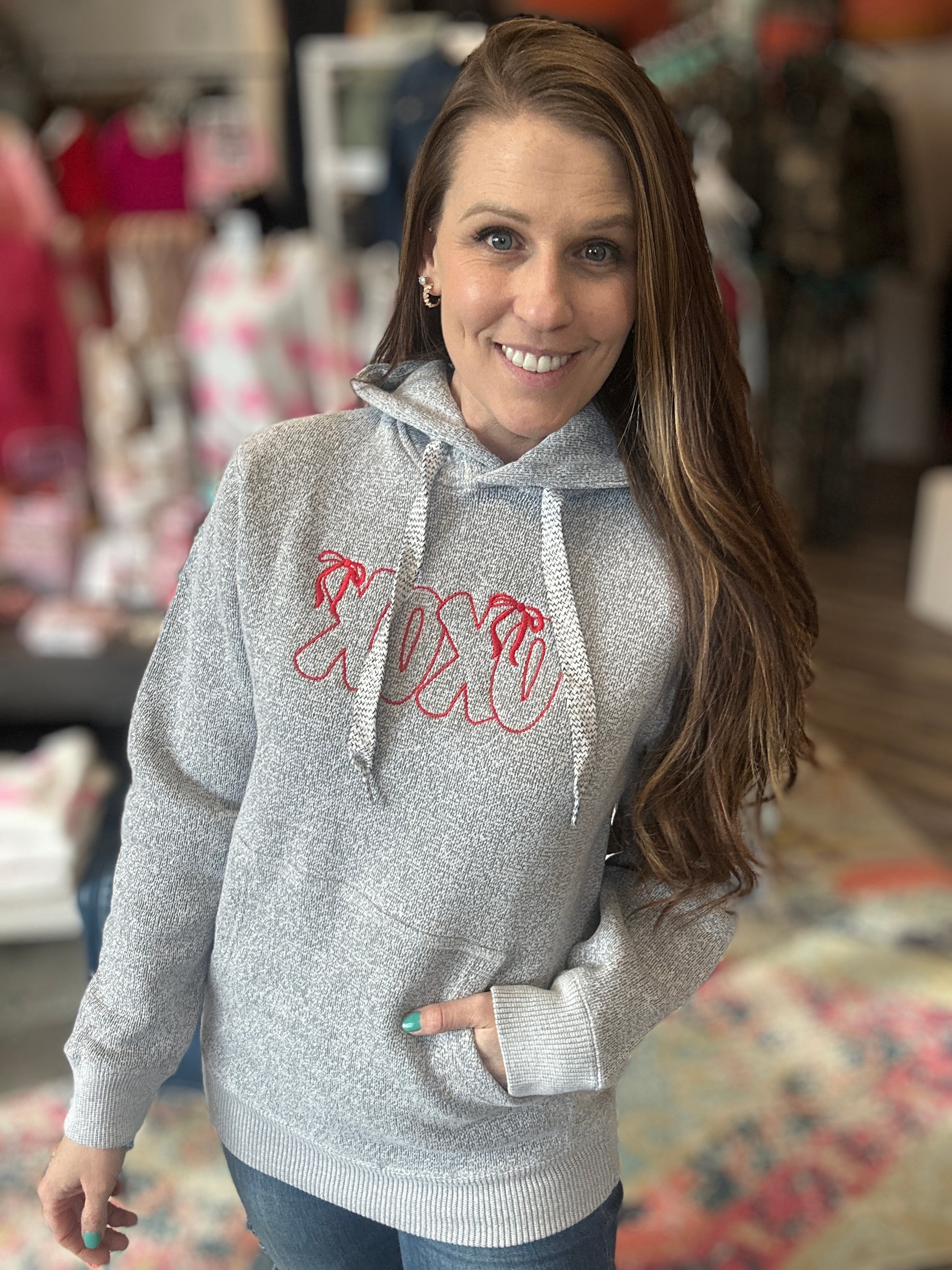 Wrap yourself in cozy vibes with this salt and pepper heather grey hoodie, featuring a playful red embroidered "XOXO" across the chest. Lined with plush fleece, it's the ultimate comfort piece for lazy days and casual hangouts. Perfect for showing some love while staying snug and warm. Your new favorite go-to hoodie awaits! SO GOOD